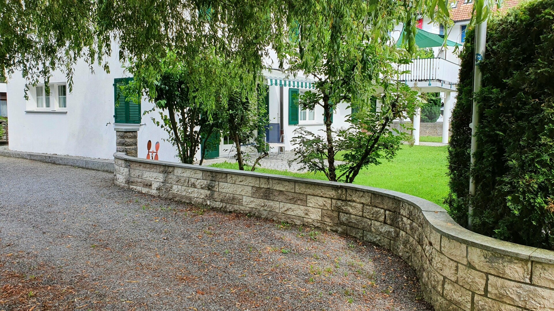 Der Parkplatz für max. ein Mittelklasse Fahrzeug ist an der Mauer. Für grössere Fahrzeuge empfehlen wir den Parkplatz nähe Fussballplatz zu benützen (CHF 5.-/Tag)